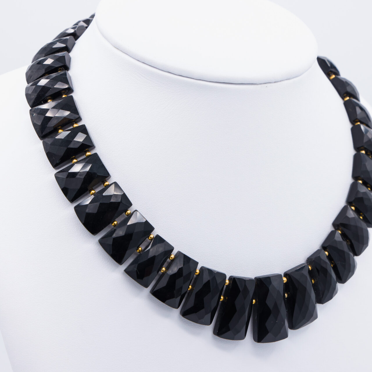Dramatic and regal, this necklace features faceted onyx beads designed in a Cleopatra-inspired style, creating a bold, structured silhouette that commands attention. The glossy black stones catch the light, adding depth and elegance to the piece.